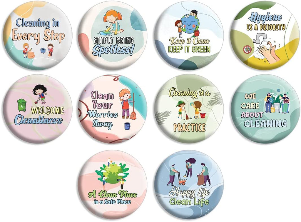 Creanoso Clean Up Badge Pinback buttons (1-Set X 10 Buttons) - Stocking Stuffers Premium Quality Gift Ideas for Children, Teens, & Adults - Corporate Giveaways & Party Favors
