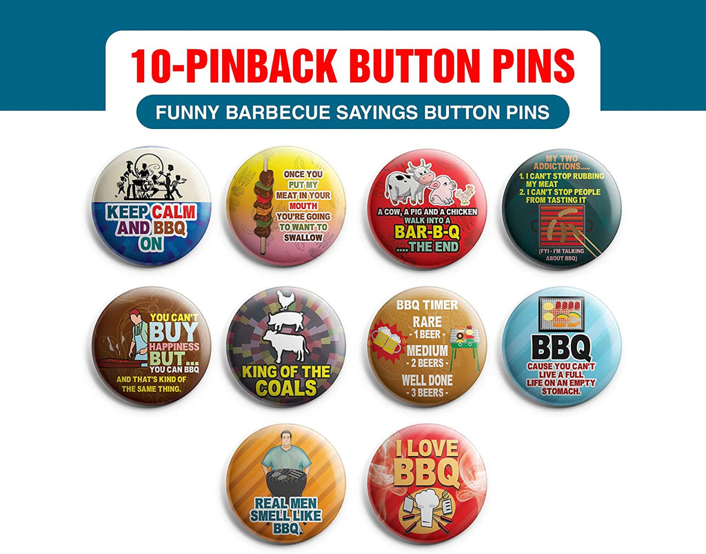 Creanoso Funny Barbecue Sayings Button Pins (1-Set X 10 Buttons) - Stocking Stuffers Premium Quality Gift Ideas for Children, Teens, & Adults - Corporate Giveaways & Party Favors