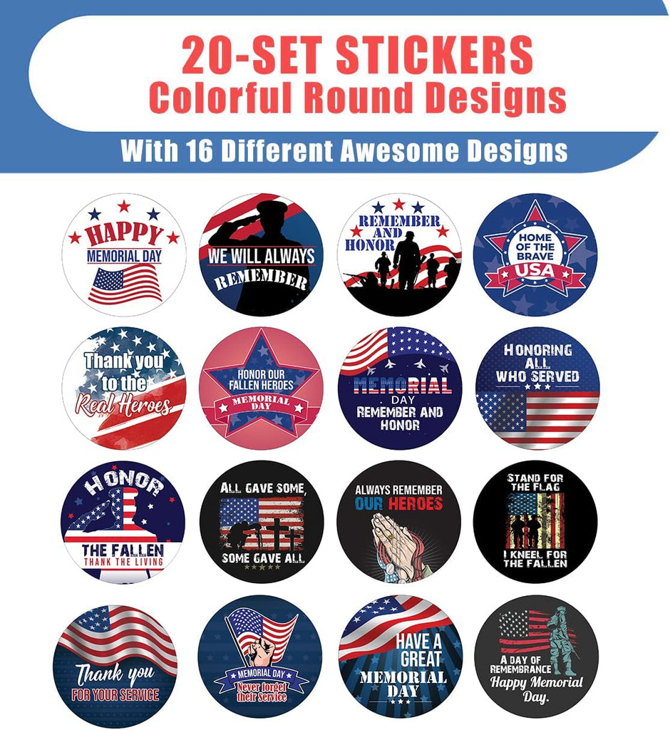 Creanoso Memorial Holiday Stickers (20 Sets X 16 Designs) – Sticker Card Giveaways for Kids – Awesome Stocking Stuffers Gifts for Boys & Girls – Classroom Home Rewards Enticements