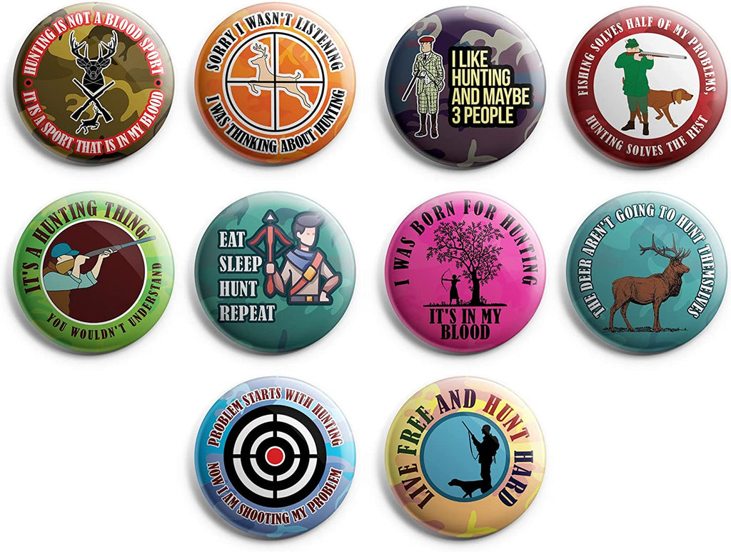 Hunting Button Pins (1-Set X 10 Buttons) This set contains Positive Pinback Button with colorful designs, unique, and funny quotes that is suitable for all. Wear it with confidence. This set contain 10 different designs You can pin it anywhere and everywhere you like, whether on your clothes or on your bag, you would not be disappointed. Give this to your friends, families, and relatives as giveaways and party favors and surely they would love it. Have fun and enjoy with these great set of colorful and stylish gift products brought to you by Creanoso.
